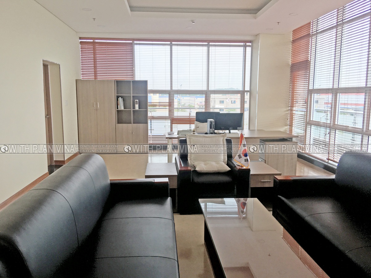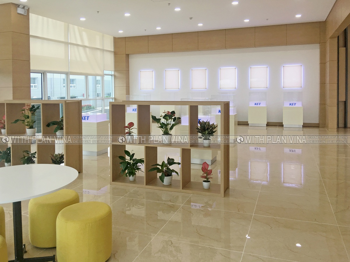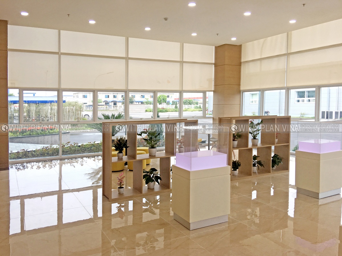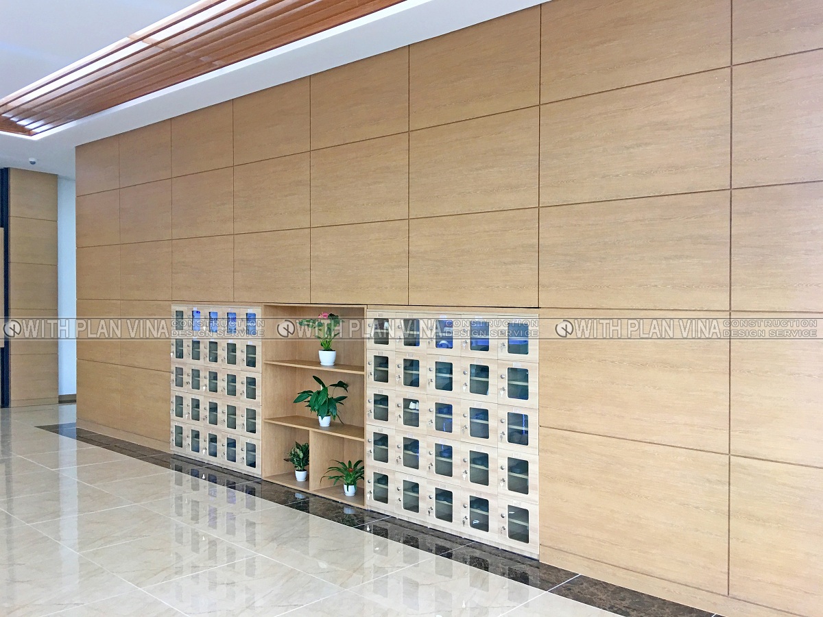 We designed office space with polite, elegant and equally luxurious style. Around the workplace are many ornamental plants, bringing comfort and cool to the office area.The shoe cabinets are designed with many separate compartments and are attached to the glass panels, creating neat, clean and easy to use when people come here to work.